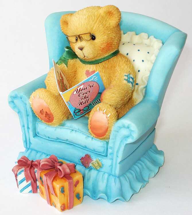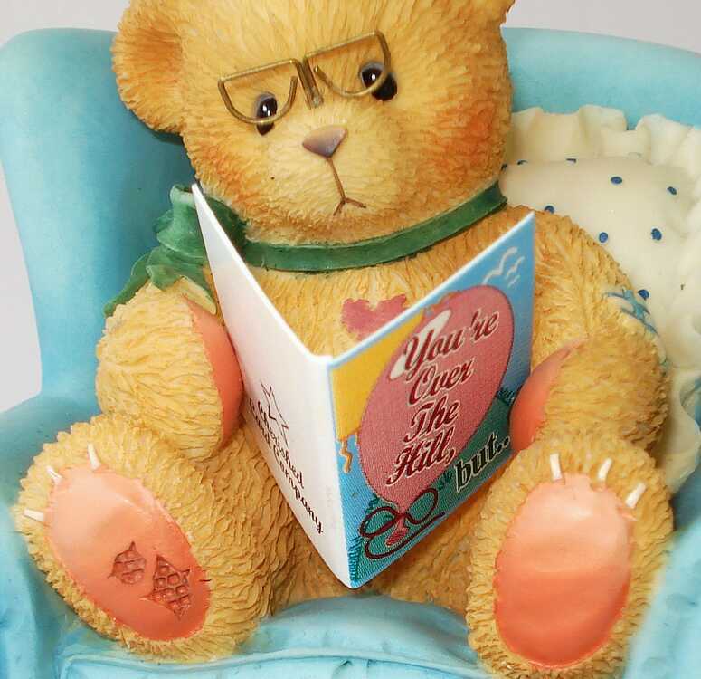This sweetie is sitting in his blue lounge chair as he reads his birthday card. The card say's "Over The Hill" on the front and inside says "I Love You As You Are, Happy Birthday"